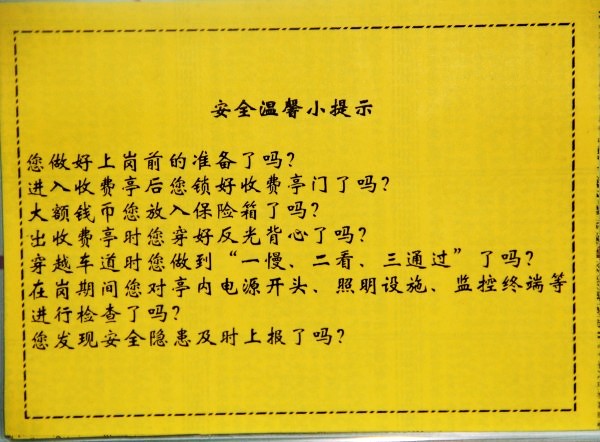 在全國第十三個(gè)“安全生產(chǎn)月”期間,宣化東收費(fèi)站采取一系列有效措施,確保“安全生產(chǎn)月”活動取得良好效果。